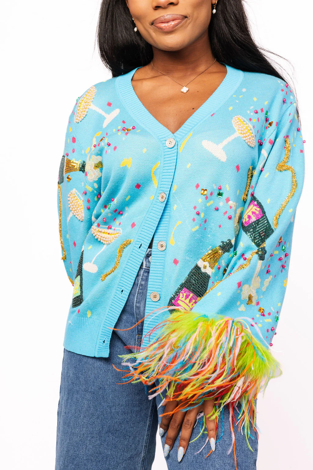 Raise a toast in this show-stopping aqua cardigan! Adorned with a champagne bottle and coupe design, it's the ultimate celebration piece. The real magic? Multi-colored feathered sleeve cuffs that add serious glamour and movement with every gesture. Perfect for parties, nights out, or whenever you want to sparkle and shine. Button up and get ready to turn heads.