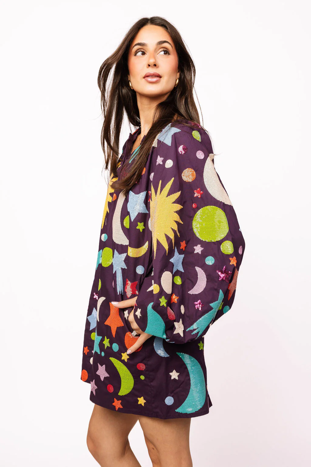 Step into a cosmic dream with this enchanting dark purple galaxy button-up dress. Featuring whimsical bubble sleeves that add a touch of playful charm, this cotton piece brings celestial vibes to your everyday wardrobe. The allover multi-galaxy print creates a mesmerizing backdrop, while functional buttons make dressing effortless. Perfect for anyone who loves celestial-inspired fashion with a fun, feminine twist. Comfortable, eye-catching, and utterly magical.
