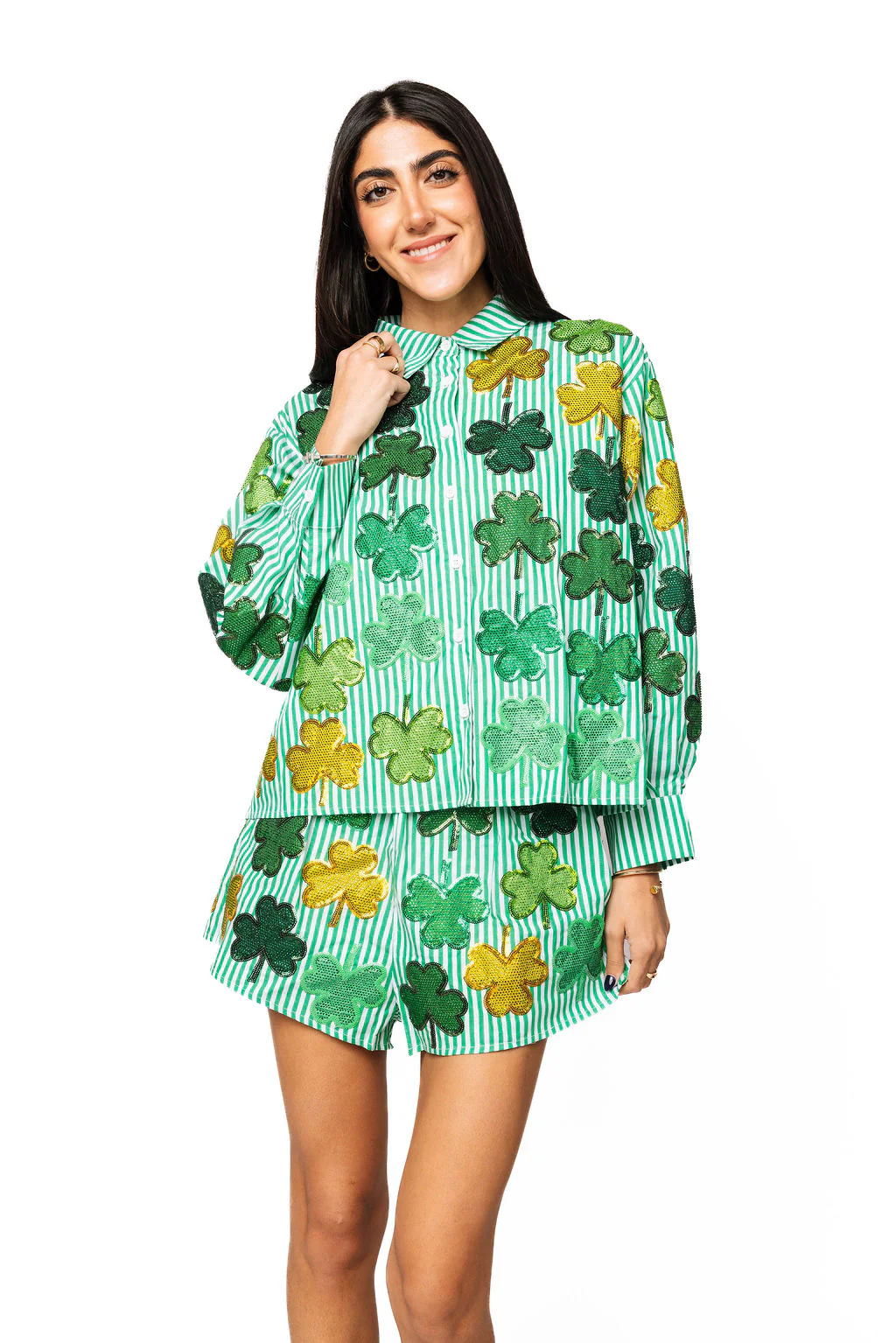 Luck is on your side in this vibrant green and white striped button-up featuring dazzling rhinestone shamrocks scattered all over. The long sleeves and classic button closure make it effortlessly chic, while the sparkly shamrock details add that perfect festive flair. Style it solo for instant personality, or pair with our matching shorts to create a coordinated look that'll have everyone green with envy. Perfect for St. Patrick's Day celebrations or whenever you want to shine!