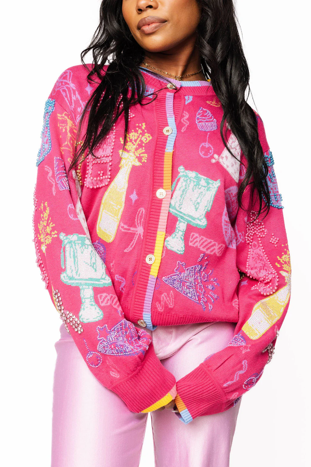 Celebrate in style with this hot pink cardigan that's practically a party in itself! Adorned with whimsical birthday icons—think cake slices, champagne bottles, and festive details—this piece features a vibrant rainbow trim that adds the perfect pop of color. Whether you're the guest of honor or just spreading birthday cheer, this cardigan transforms any outfit into an instant celebration. Cozy, fun, and unapologetically festive, it's your new go-to for making every occasion feel special.