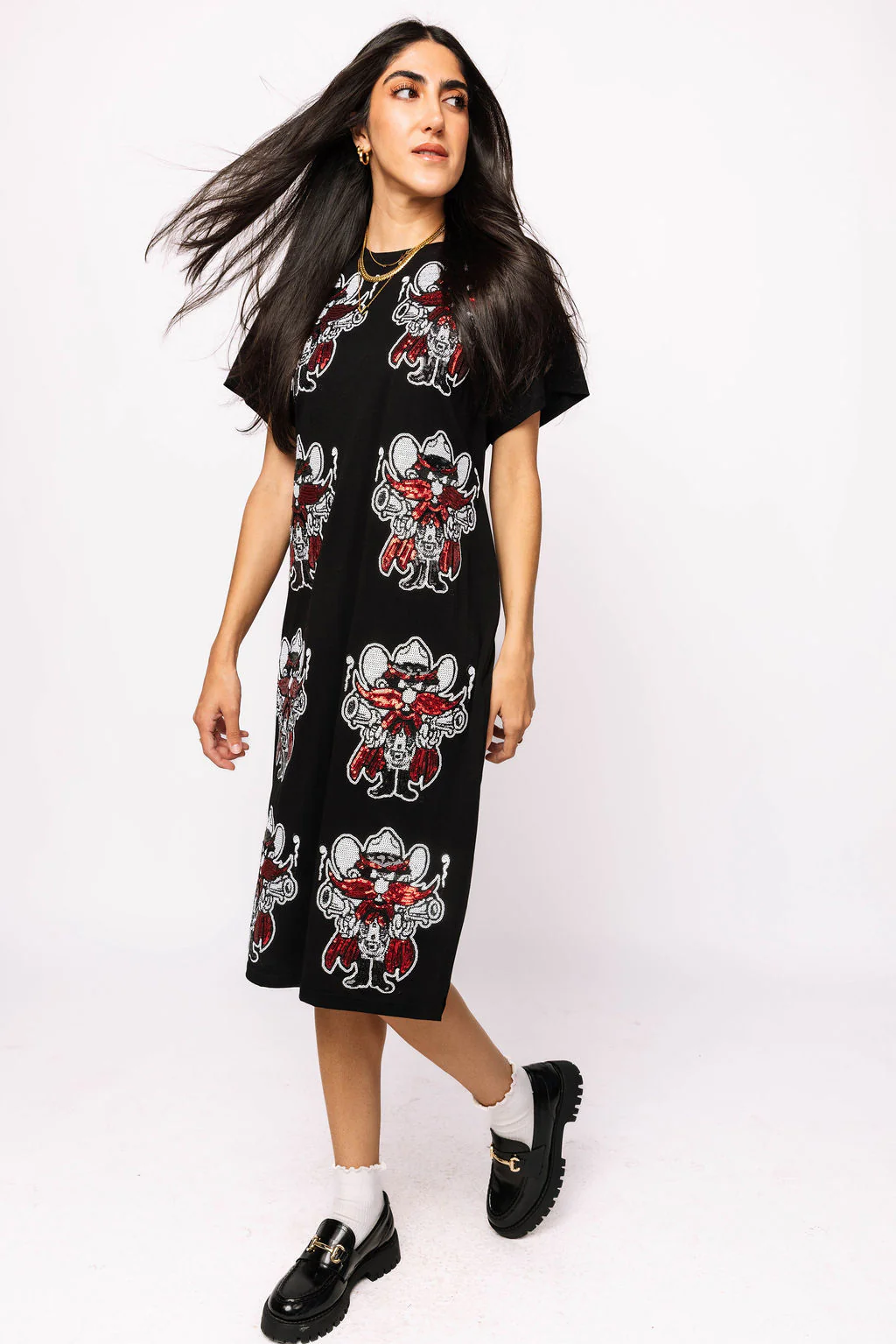 Show your team spirit in style with the Licensed Texas Tech Mascot Midi Tee Dress. Featuring a dazzling sequin design, this lightweight and comfortable dress is perfect for game day excitement. Its breathable fabric ensures you stay cool while cheering on your favorite team, making it an ideal choice for fans who want to combine comfort with standout flair.