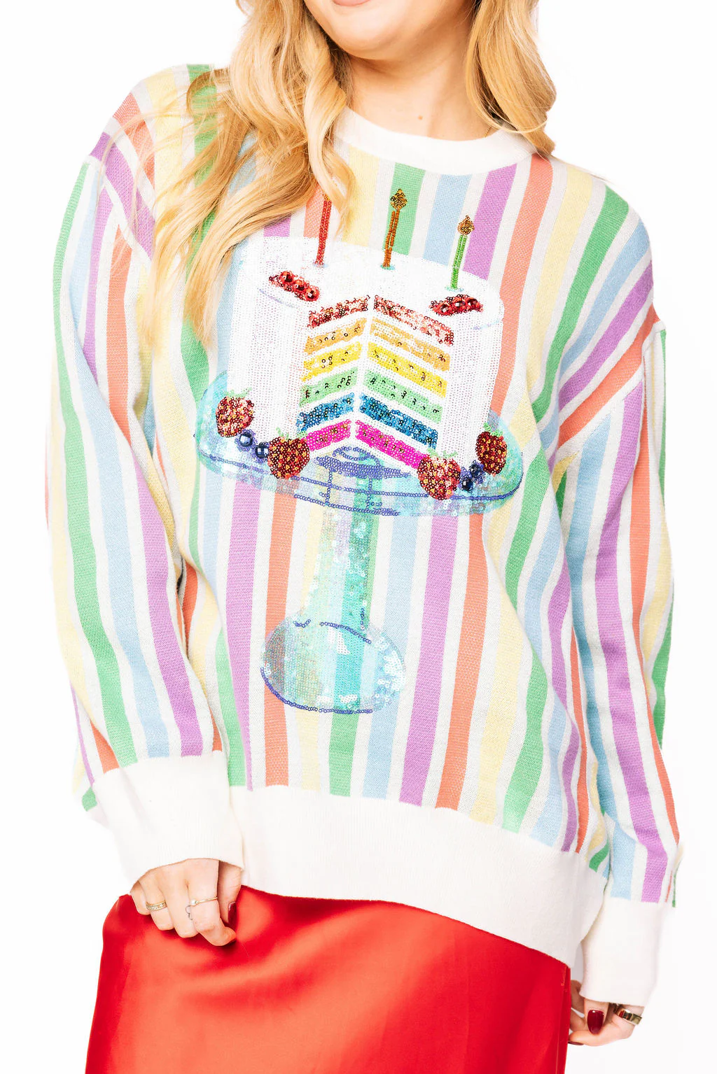Celebrate in style with this vibrant oversized sweater featuring bold rainbow stripes and a whimsical birthday cake design. Perfect for making a statement at parties, casual hangouts, or whenever you want to spread joy and color. The relaxed fit offers comfort and movement, while the eye-catching pattern brings instant personality to any outfit. Whether you're the life of the party or just love fun fashion, this sweater delivers playful vibes and cozy warmth all season long.