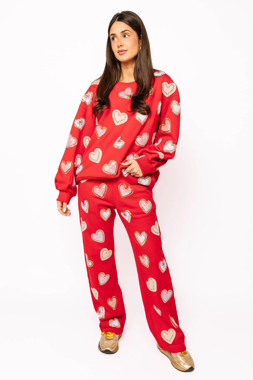Wrap yourself in cozy Valentine's vibes with this adorable red oversized sweatshirt featuring charming heart cookie designs on both the front and back. The relaxed, oversized fit is perfect for lounging, layering, or making a sweet statement. Pair it with our matching pants for an effortlessly cute coordinated look that celebrates love in the most delicious way. Soft, comfortable, and totally Instagram-worthy—because nothing says romance like cookies and cuddles.