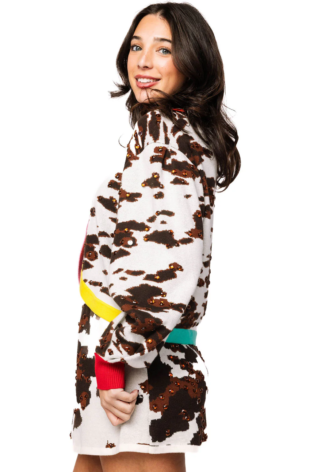 Moo-ve over, basic basics! This adorable cow print cardigan is your new go-to for making a statement. Featuring a classic button-up silhouette with a crisp collar and eye-catching multi-color trim details, it's the perfect blend of fun and fashion-forward. The jewel accents add just the right amount of sparkle to keep things playful. Style it solo for instant personality, or pair it with the matching skirt to create a coordinated look that'll have everyone asking where you got your outfit. Perfect for anyone who loves to stand out with style and sass.
